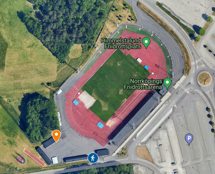 OBS! På bilden nedan ser du plats och in-/utgång på arenan för nummerlappsutdelning. Utdelning sker vid orange markering på kartan, in-/utgång till arenan vid den blå markeringen.